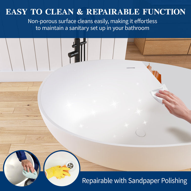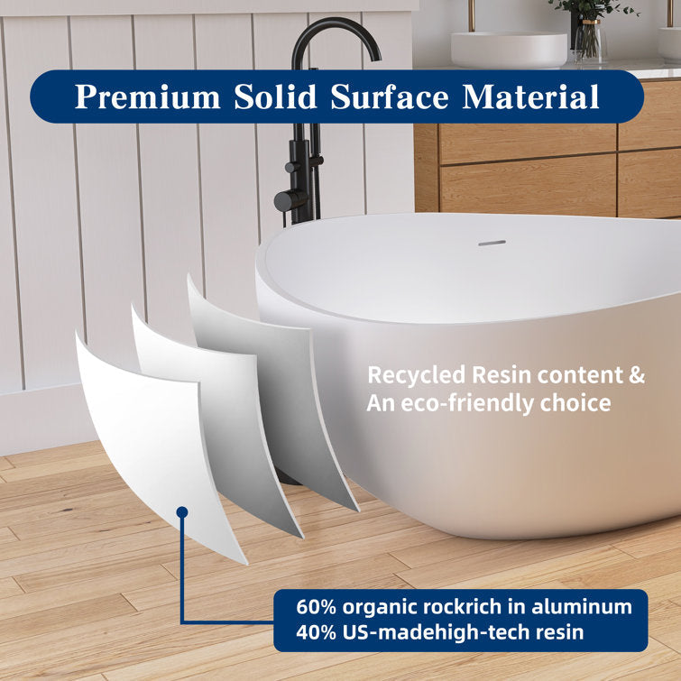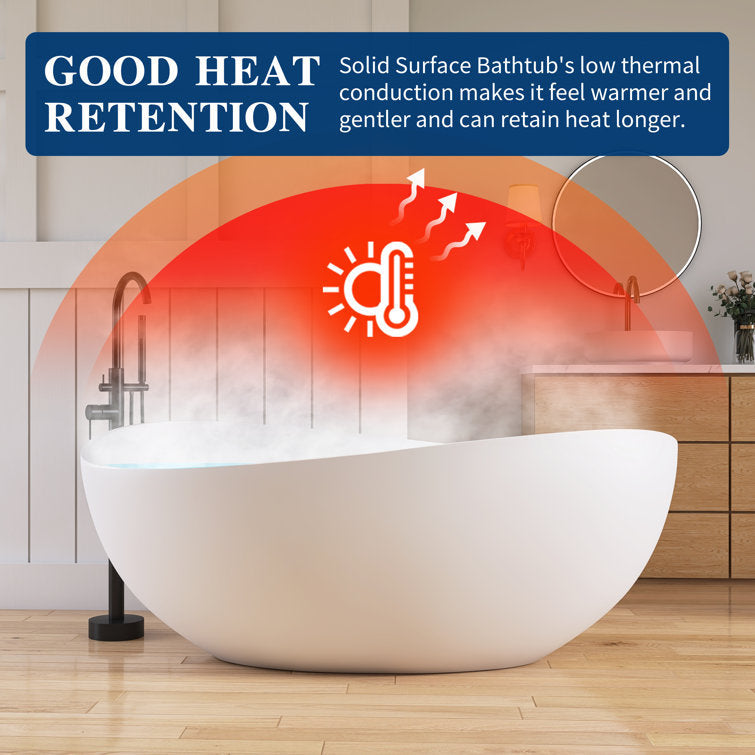Accentuate your modern bath with this artistic and elegant freestanding bathtub. The curvaceous wavy design makes a beautiful focal point from any angle for your bathroom, sure to impress guests or family. The curved interior and smooth touch surface help facilitate a comfortable bathing experience. Made with high-quality non-porous solid surface material for a beautiful consistent finish as well as improved leak-resistant durability and easy cleaning capability. Crafted from 100% eco-friendly handmade Resin Stone, non-porous, 100% fade-resistant, natural stone feel. Perfect for adding a little bit of sophistication to any bathroom, home improvement project, or house flip. ts excellent heat retention ensures a long, soothing soak, akin to being cocooned in luxury. Its corner-friendly design makes it ideal for both indoor and outdoor settings, Advanced lightweight pure white stone resin keeps bathwater warm and cozy, while durably resisting any scratches or staining. Includes pop-up drainer, the bottom outlet is in the center, and the drain hose (not included in the price)