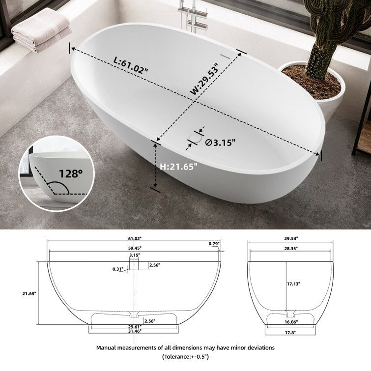 Lasaideal 61'' Freestanding Tub Solid Surface Stone Resin Free Standing Soaking Bathtub