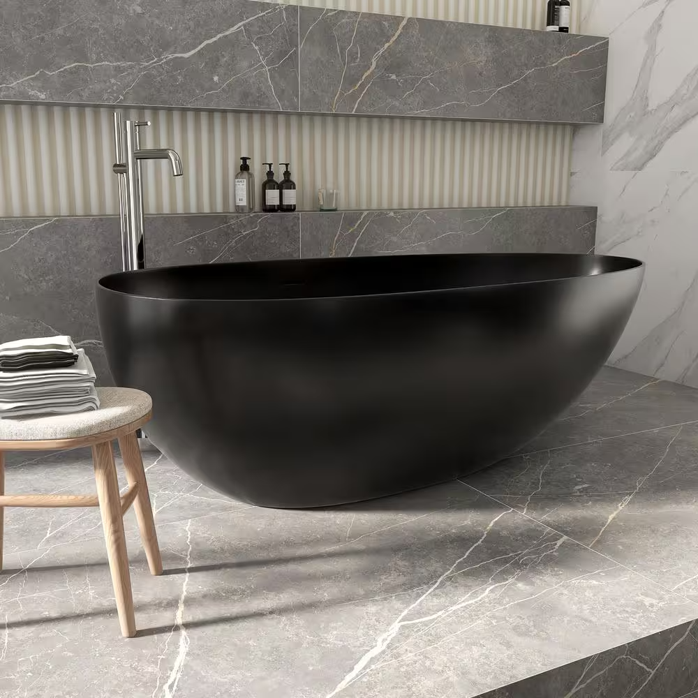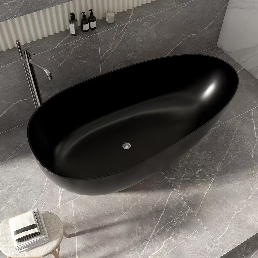 This LUNA bathtub by MEDUNJESS is an egg-shaped freestanding bathtub made of resin stone solid surface. Its egg shape design allows for different angles on both sides and provides unique experiences. The classic matte black finish makes this bathtub a standout feature in your bathroom. Also available in a variety of colors and sizes.